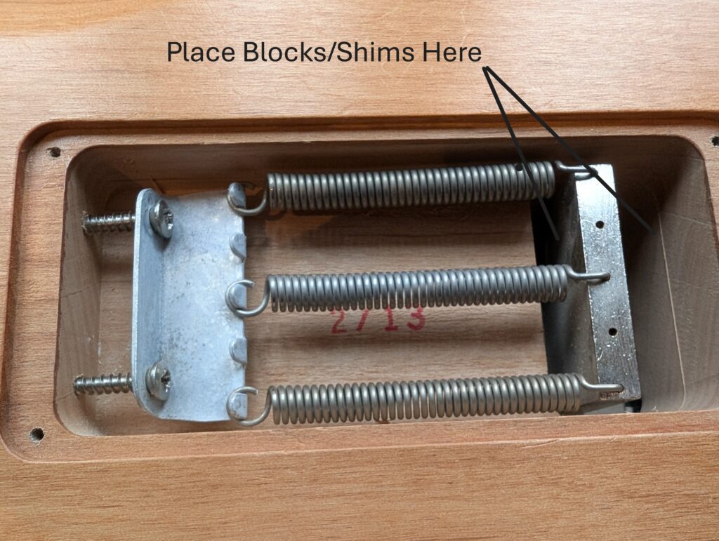 You should find that as the plate levels, the guitar will become in tune again or not far off. Adjust the tuning now so that it is in tune again. If necessary, you may have to adjust the spring claws to level out the tremolo and retune again, but if you have blocked the tremolo during the change then you should have to do this fewer times!