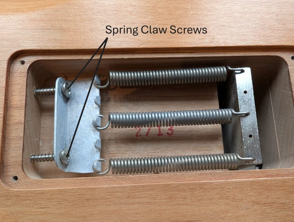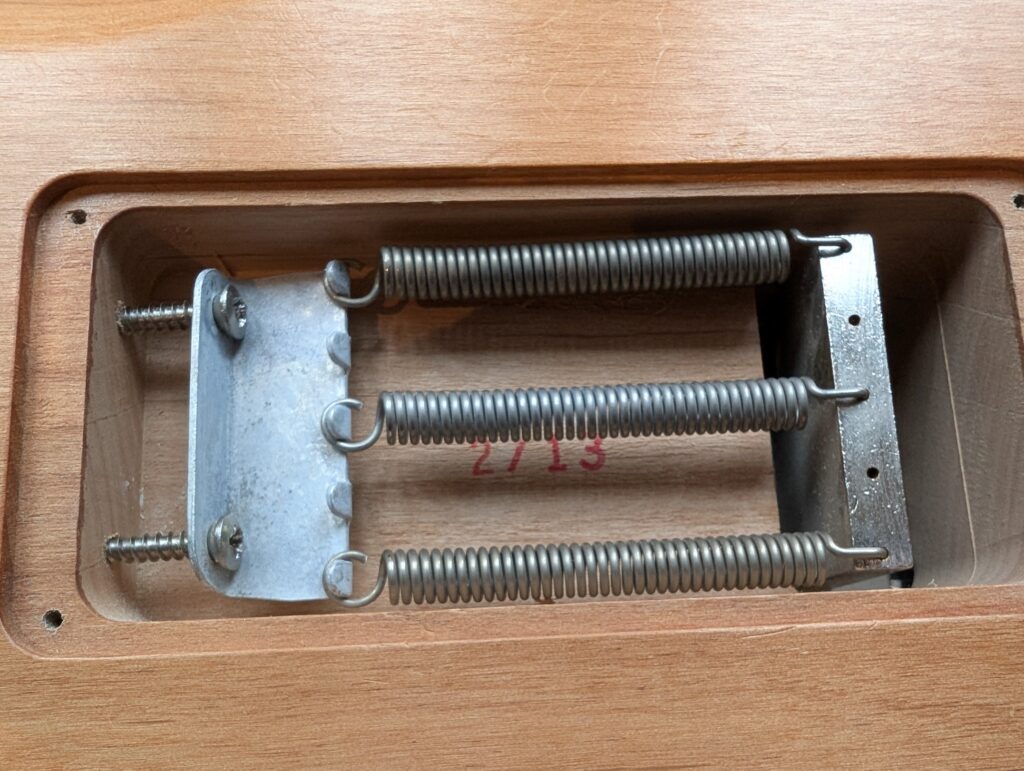 Finally in the back of the guitar you will find the springs which counterbalance the tension of strings. When the locking tremolo is set up and balanced, the bridge should be perfectly flat.