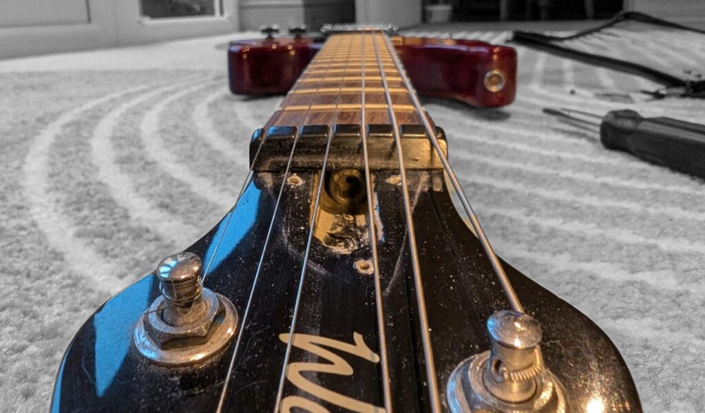Now is a good time to check the height of the strings at the nut of the guitar, this can be a good test as, even if set up correctly, if there is a problem with the nut, there may be issues. the height of the string at the first fret should be above 0.5mm (0.020″), if it isn’t, this may indicate wear at the nut and it may require replacement, which is beyond the scope of this guide. A quick dirty temporary fix would be to pack the offending string slot by placing a shim under the string, a sturdy piece of card might work.