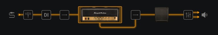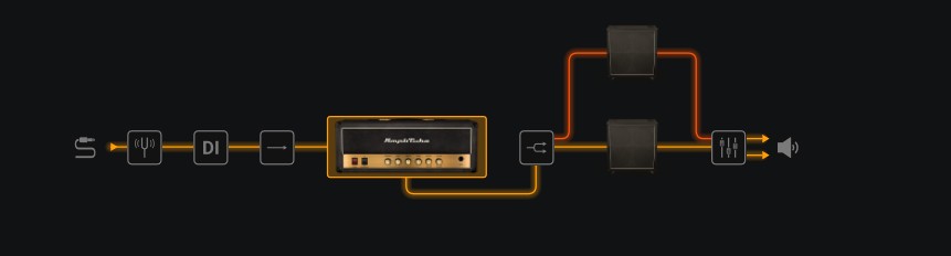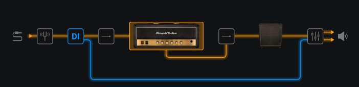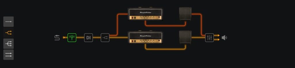 The next item is the Direct Input option. If this icon is clicked you will notice a blue line appear from the DI box to the final mixer at the end. All this does is mix a bit of the unmodified raw guitar signal into the final output sound, how much is decided at the mixer stage at the end. It’s not a feature I would generally use but I’m sure some people find it useful. Click on the DI box again to cancel it.