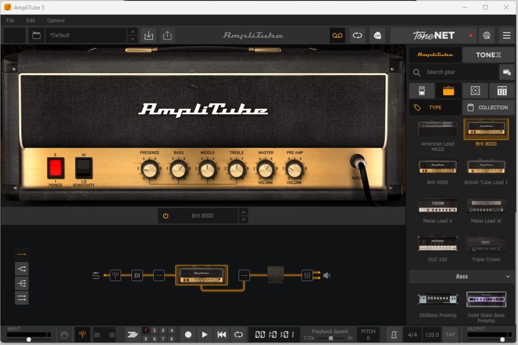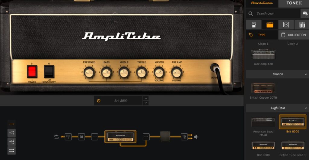 When opened for the first time, the program opens to the default pre-set which is the Brit 8000 amplifier and the 4×12 Brit Cab with no effects. Give it a strum and try it out, you should be able to hear a lightly distorted tone which would work well with a song like “Sweet Home Alabama?” Turn the monitor/headphone volume to a comfortable level on the Scarlett 2i2 and have a play. When your ready I’ll walk you through the main features of the Program.