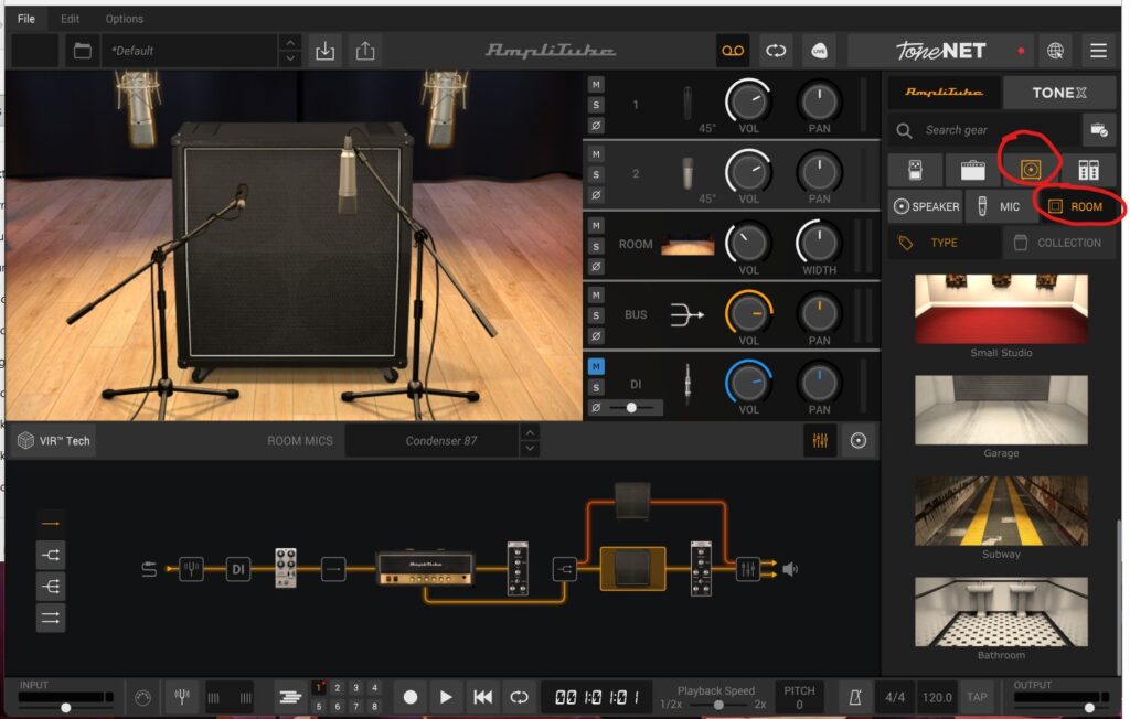 Another handy feature to know about is that the environment in which the speaker cabinets are located can be changed and this provides an opportunity to further modify the sound. To alter this click on the speaker icon and the the room icon as highlighted below. The user is then given the option of different studios, a garage, subway and bathroom environment which are fun to experiment with.