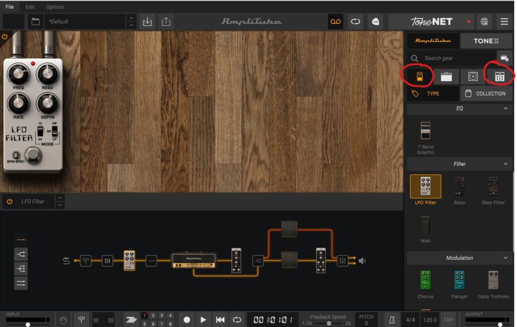 There are two different effects types in AmpliTube 5, Stomp box and rack effects. These are found by clicking on the icons highlighted below. The effects can be inserted into the effects by dragging them into the signal chain before the amplifier or after the amplifier. As a general rule, insert the stomp box effects before the amplifier and rack ones after. There’s a whole other conversation about which order effects should go in which I’ll leave for another article! If you are a beginner, I encourage you to try out each of the individual effects to get familiar with what they do.