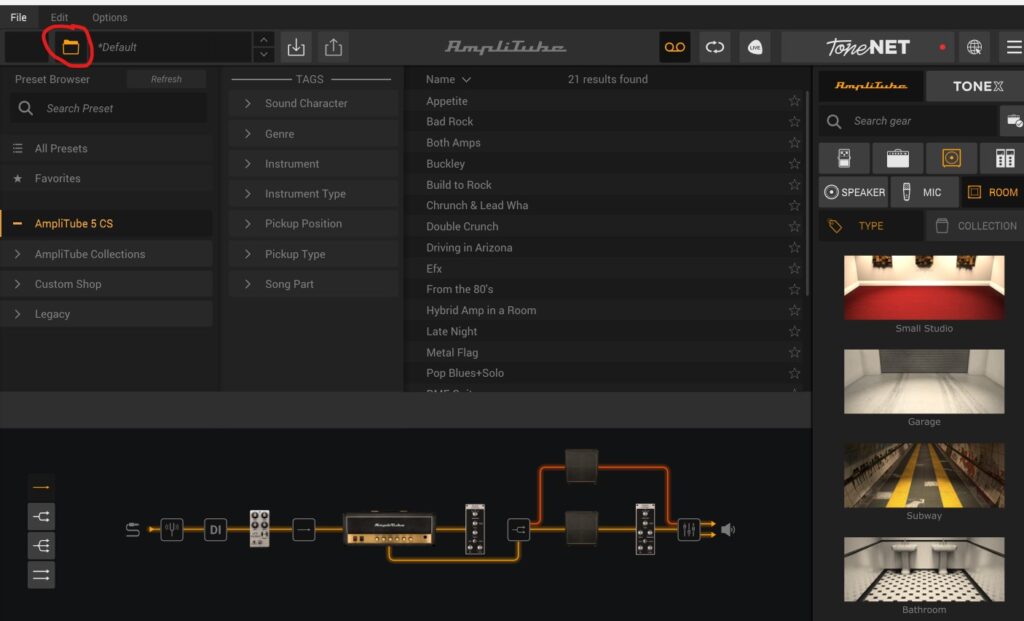 The last feature I’m going to highlight is the pre-sets. These can be accessed by the folder icon in the top left of the screen. Clicking on this shows a pre-set browser, if you click on AmpliTube 5 CS it brings up a number of pre loaded pre-sets to explore and have fun with. I find that if I am looking for a particular sound, browsing these tends to get me close and then I can tweak the signal chain to get it perfect. If you manage to make a tone that you like you can also save it as a pre-set to access later.