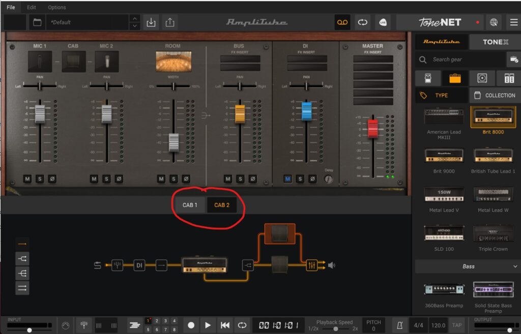 The final part of the signal chain is the mixer, here you can alter the volume and pan of all the individual elements in your signal chain. Be aware that if you have two cabinets in your signal chain there is a mixer setting for each one just below the mixing console as highlighted below.
